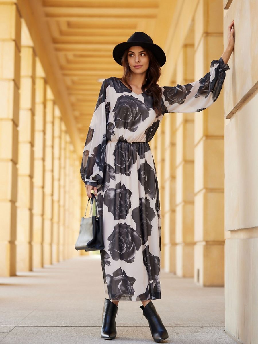 Ariela is a long dress made of chiffon material, which beautifully lends itself to movement. Interesting patterns add to its originality and uniqueness. The dress has long, semi-sheer sleeves, which create a buff effect. The V-shaped neckline beautifully accentuates the neckline and neckline, while the sewn-in elastic waistband guarantees an hourglass effect. The dress has a lining that prevents it from showing through. Ariela dress is a suitable choice for various occasions. With the right accessories, the creation is perfect for formal and everyday outings. The long, patterned Ariela dress will go well with black suede boots and a small shoulder bag. The product is made and sewn in Poland.