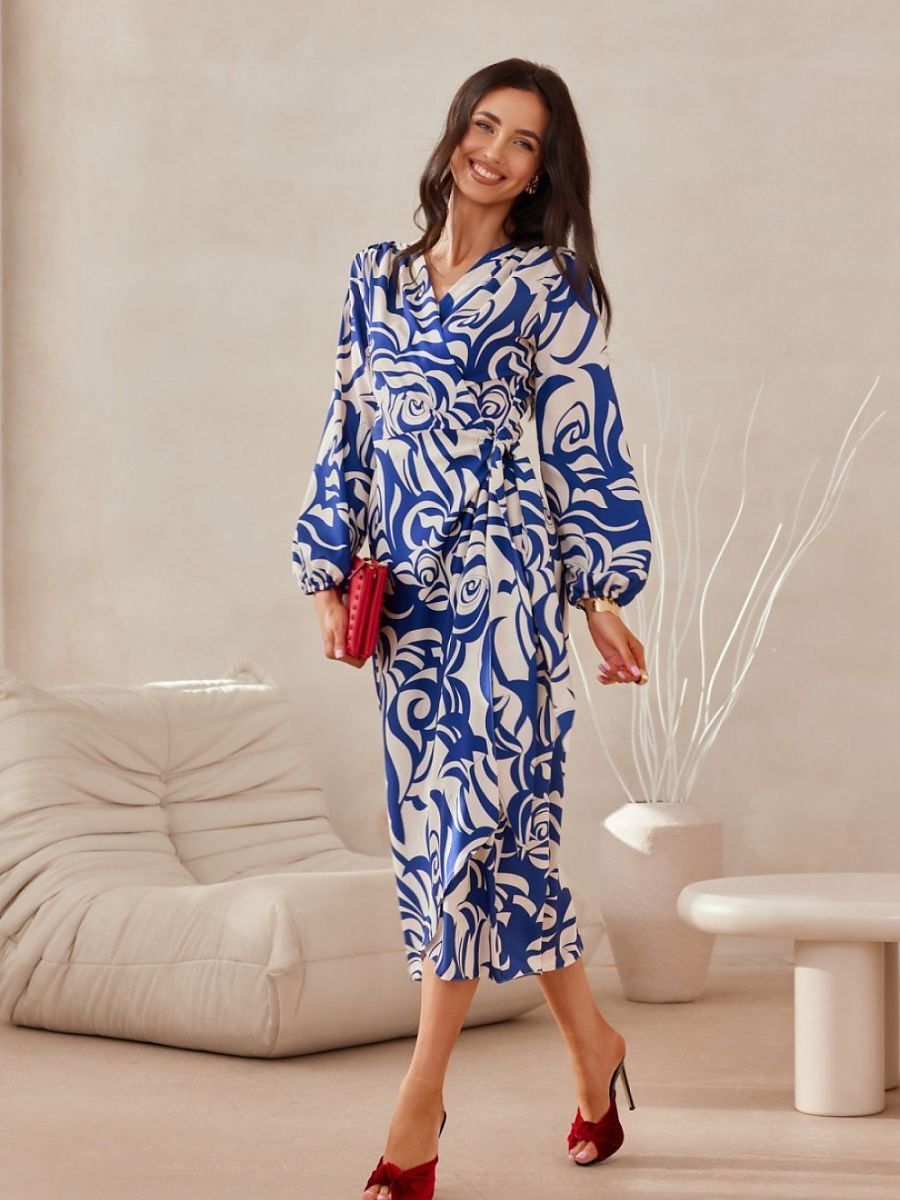 Midi dress with long sleeves. The top is wrap, and the bottom is slightly flared. It does not have a lining, with a double tie at the waist.
